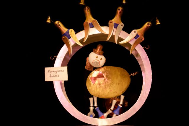 I taki jest litewski spektakl. Trwa czterdzieści minut, angażuje i dzieci, i dorosłych, zwłaszcza że dodatkową atrakcją jest obecność na scenie kompozytora. Arkadijus Gotesmanas skomponował muzykę podkreślającą raczej nastrój poszczególnych scen, ale warstwa dźwiękowa przedstawienia jest wzmocniona na żywo budowaną przez kompozytora-perkusistę sferą brzmień. Chciałoby się nawet, żeby była ona mocniejsza, bardziej wyrazista, silniej akcentująca akcję sceniczną i bardziej prowadząca spektakl.