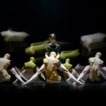 Spektakl przebiega w rytmie następujących po sobie dni i nocy. Kiedy zapada noc, poszczególne domki są zasłaniane ramami z czarnym tiulem, na którym blikują resztki wygasających świateł. Urokliwe sceny. I w sumie nie przeszkadza nawet powtarzalność tych cykli i czynności, bo odbywają się one w innym rytmie, z rozmaitymi modyfikacjami i elementami humoru.