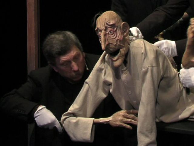 I chyba mogę dodać, że tę bezbronność pokazują lalki Mydlarskiej-Kowal – zniekształcone, mroczne, skonstruowane na kształt postaci ludzkich, z ruchomymi oczyma i ustami. „Lalki uzyskują nawet pewną mimikę twarzy właśnie dzięki ruchom ust i zamykaniu powiek, odpowiedniemu ustawianiu względem światła oraz odpowiednio komponowanemu rytmowi ruchu całej postaci, zmianie dynamiki i tembru głosu. Co więcej, gruntowne rozpoznanie lalki jest niezbędnym warunkiem realizacji określonych zadań artystycznych. Twarz lalki jest maską nałożoną na czaszkę, co jest ważne dla semantyki przedstawienia. Lalka Józefa K. przebierana w trakcie przedstawienia traktowana jest jak przedmiot, w końcowej scenie zostaje uczłowieczona, aktor bierze ja na ręce jak dziecko.” (Małgorzata Strońska-Zaremba)