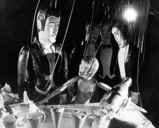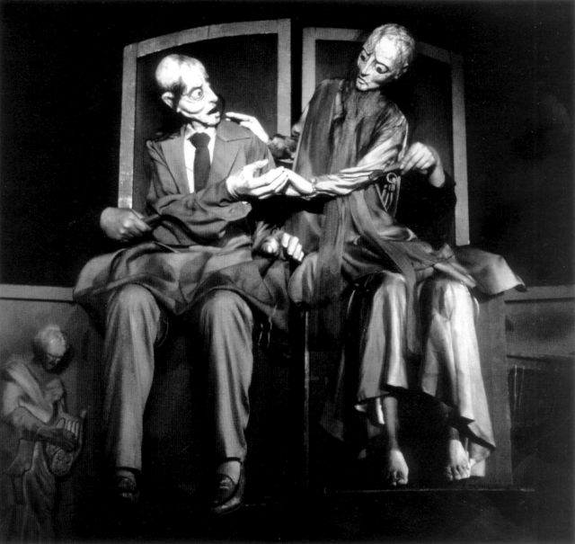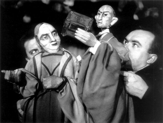 W Fauście arsenał lalek jest bodaj najbogatszy. Pojawiają się tam proste kukły, pacynki, płaskorzeźby, lalki-maski, kościotrupy, a sam Faust jest skomplikowaną konstrukcją à la bunraku. „Lalki w tryptyku – by jeszcze raz zacytować Strońską-Zarembę – stanowią twórczy powrót do tradycji teatru lalek. Skonstruowane są na podobieństwo postaci ludzkich, posiadają ruchome oczy i usta. W tryptyku są niemalże wielkości człowieka. W powłóczystych szatach prowadzone przed aktorem w taki sposób, iż użycza on im nóg będąc jakby cieniem, odbiciem lalki.”