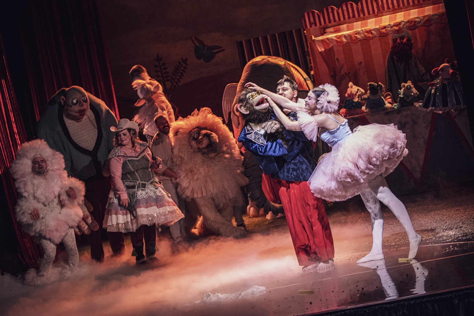 Sam spektakl z historyczną Tarabumbą łączy się bardzo luźno, lecz nieustannie przypomina postaci, które pojawiły się w przedstawieniu Jaremy: Słonia (Lech Walicki), Pudla (Paweł Mróz), Lwa (Andrzej Kopczyk), Ducha onegdajszych klownów Łatka, Kwiatka i Gagatka (Maja Spychaj-Kubacka), oczywiście piękną Baletnicę (Zuzanna Bah; marionetka Bartosz Watemborski) i wiele innych postaci. Cały zespół aktorski ma nieustannie pełne ręce roboty, na scenie roi się od postaci, aktorów w kostiumach, masek, różnych typów lalek (autorstwa dobrze już znanej Olgi Ryl-Krystianowskiej), ruchomych elementów dekoracji, scenograficznej feerii (scenografia i kostiumy Marta Śniosek-Masacz), świetnie korespondującej z atmosferą spektaklu muzyki (Anna Stela), wyrazistej choreografii (Marta Bury), przede wszystkim wirujących kolorów, fantazyjnych kostiumów i niemal musicalowego przepychu. Takiego widowiskowego lalkowego spektaklu na polskich scenach raczej się nie zobaczy. I na dodatek tak śpiewającego zespołu (konsultacje wokalne Jarek Oberbek)!
