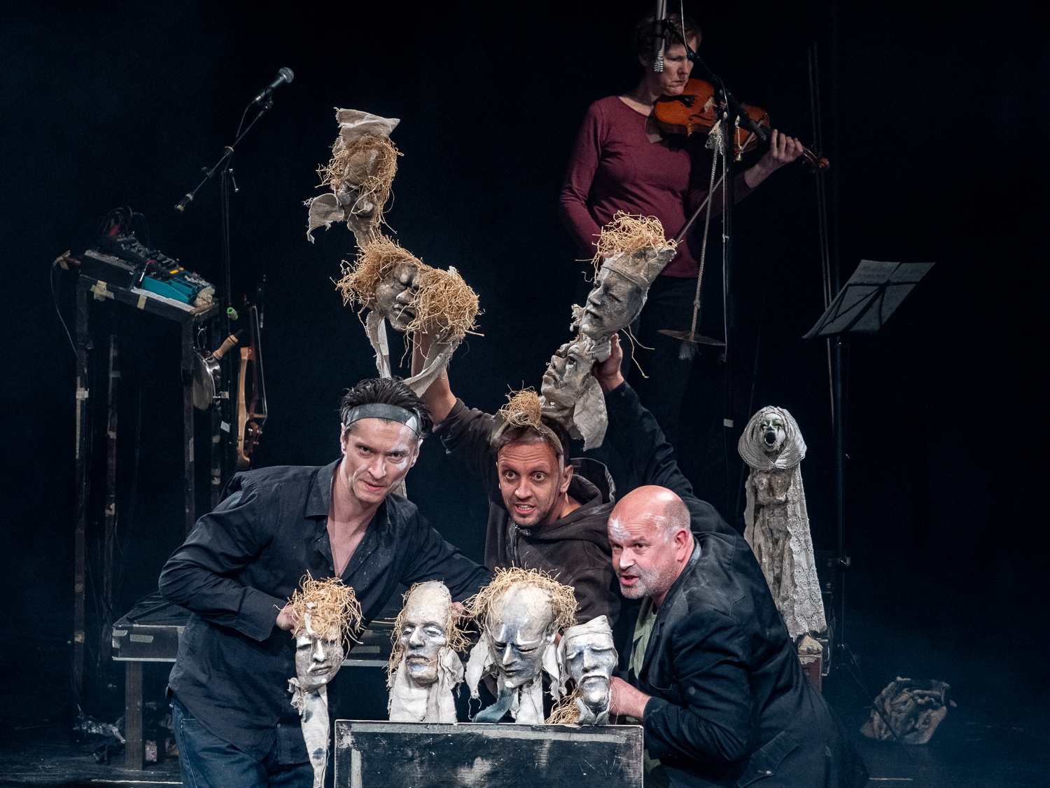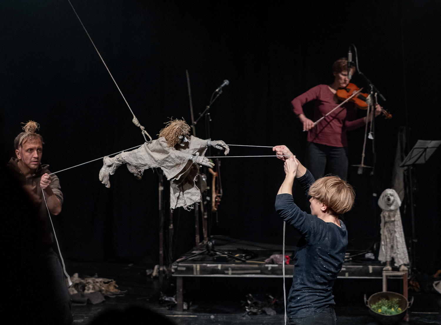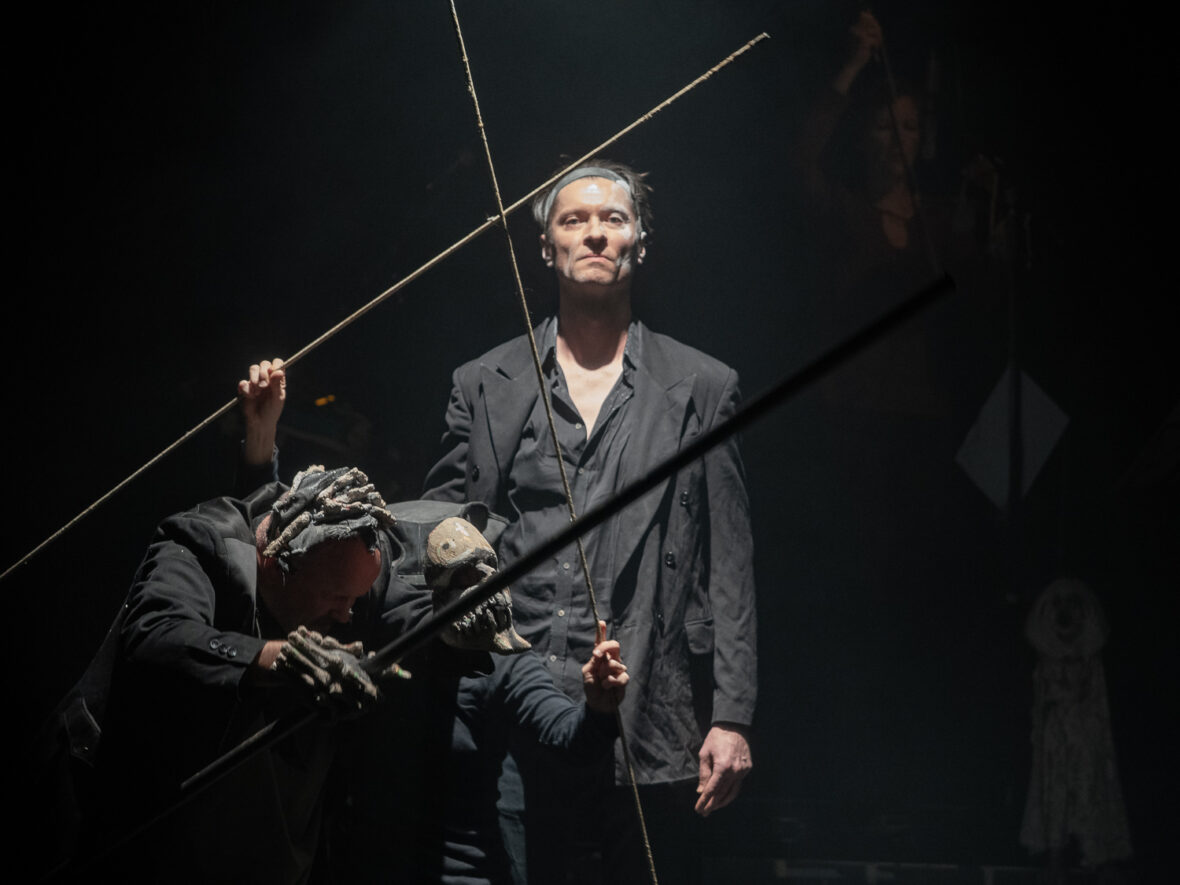 Wszystko tu jest na oczach widza. Aktorzy spotykają się niczym grupa przyjaciół, całkowicie prywatnie. Lalki, elementy dekoracji, rekwizyty pozostają w przestrzeni sceny. W jej środku, w głębi, jest tylko niewielki podest – królestwo Charlotte Wilde ujawniające jej instrumentarium. Wchodząc w różne relacje między sobą i rozmaitymi animantami, aktorzy błyskawicznie budują kolejne sceny. Wiele z nich ma naprawdę magiczny wyraz. Są tu lalki różnych gatunków, maski w rozmaitych odmianach, przedmioty, które wydają się zwyczajne, a w działaniach scenicznych nabierają elektryzującej siły. Jak wiatrak stojący z boku, którego wielokrotnie powiększony cień na teatralnym horyzoncie tworzy magiczną przestrzeń młyna. Jak figura Krabata, który w stanie snu czy marzenia, ulatuje w przestrzeń, frunie; to nic, że widzimy linki w dłoniach aktorów, do których jest podczepiony. Rodzi się magia! A zjawiskowa Śmierć w rękach Vogla, mającego na prawej dłoni kościaną rękawicę, w której trzyma kilkumetrowy żelazny drąg, w lewej wyrazistą, przerysowaną półmaskę demona, którego nieistniejące ciało kreuje Dagmara Sowa z dwóch elastycznych bambusowych tyczek, gnących się na wszystkie strony i wyznaczających kontury postaci. Takich obrazów w Krabacie jest wiele. Wykorzystane w spektaklu obiekty (autorstwa Michaela Vogla) są dziełami sztuki.