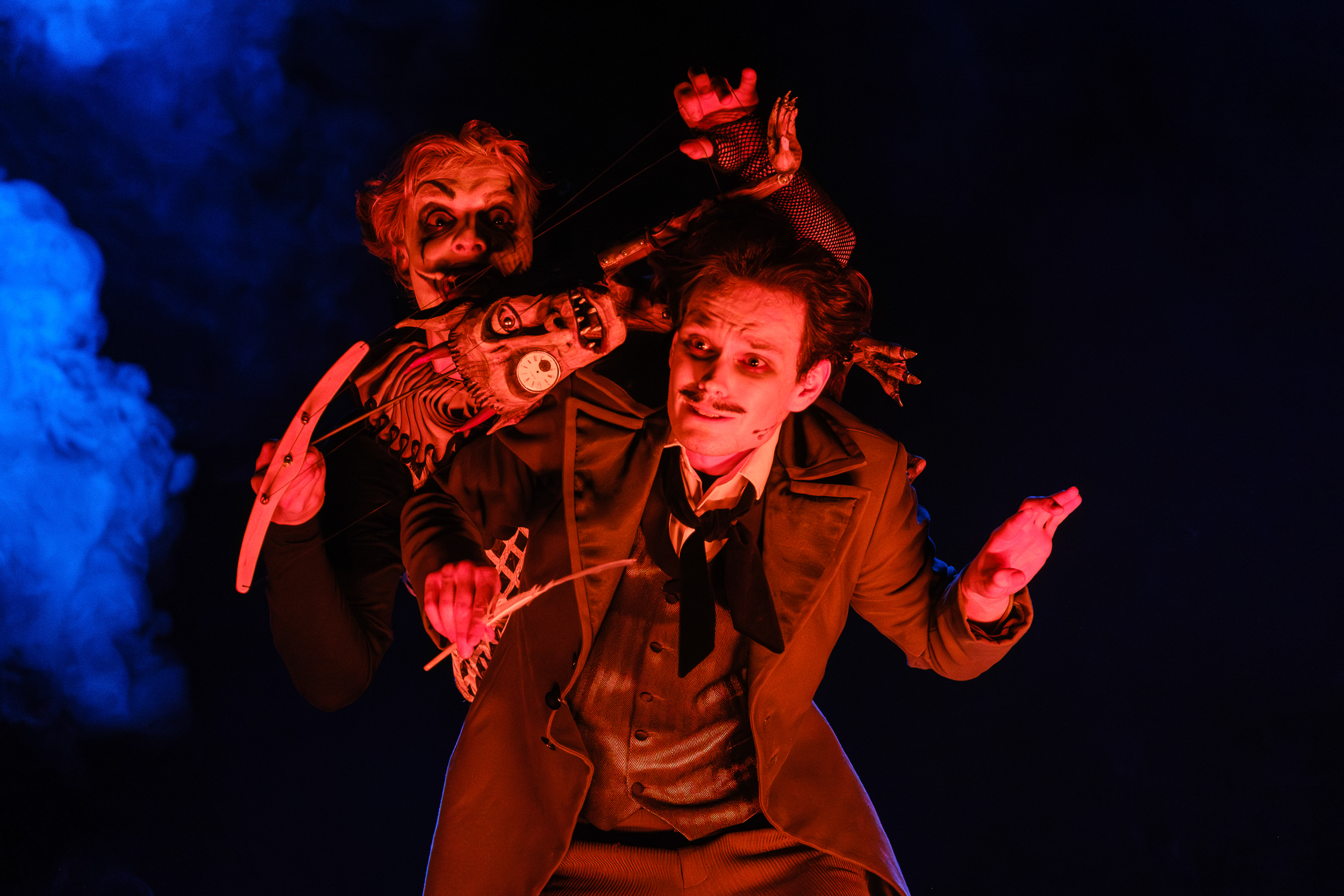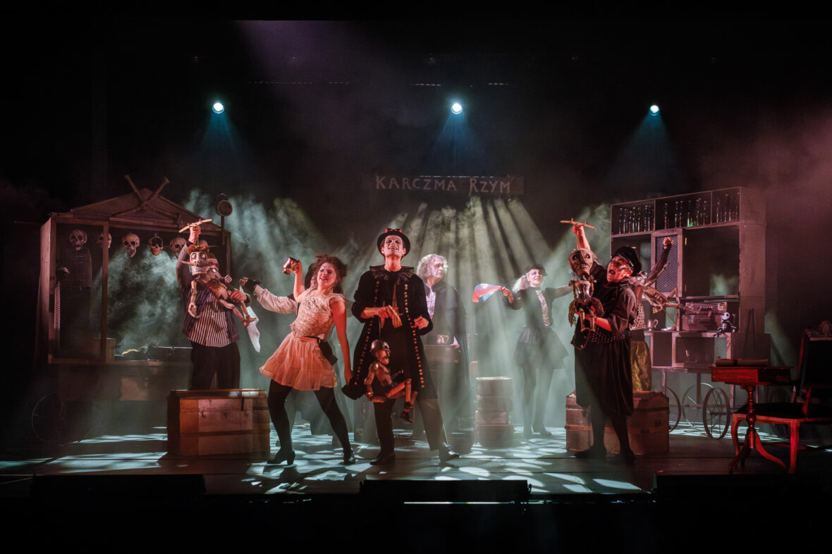 Mogłoby się wydawać, że spektakl Pani Twardowskiej to pełen sukces, bo to z pewnością przedstawienie udane, atrakcyjne i świetnie zrealizowane. Gdzie więc pułapka? Ano… lalki. Jest ich na scenie całkiem sporo. Chyba wszystkie odnoszą się do tytułowej ballady: Pani Twardowska, Mefisto, Twardowski, Żołnierz, choć pojawiać się będę i w kolejnych scenach spektaklu. Wyrzeźbił je w drewnie, według projektów Skuratovej, Rafał Budnik, wybitny polski konstruktor i twórca lalek, który szczęśliwie powrócił do zespołu Lalki. Wszystkie marionetki (bardziej w stylu czeskim niż sycylijki) są same w sobie dziełami sztuki. Zawieszone na krótkim drucie, ze sznurkami do rąk i nóg, mają pewnie ok. 80 centymetrów wysokości. Są dość turpistyczne, z wybałuszonymi oczyma, makabrycznym uzębieniem, z głowami mocno przerysowanymi, bardziej sugerującymi czaszki niż ludzkie wizerunki. Ich charaktery oddane są w precyzyjnej rzeźbiarskiej robocie, którą uzupełniają a to wielkie wąsy, a to zapięty w talii à la słucki pas, a to metalowe naramienniki, skórzane taśmy czy rozmaite konfekcyjne ozdoby.