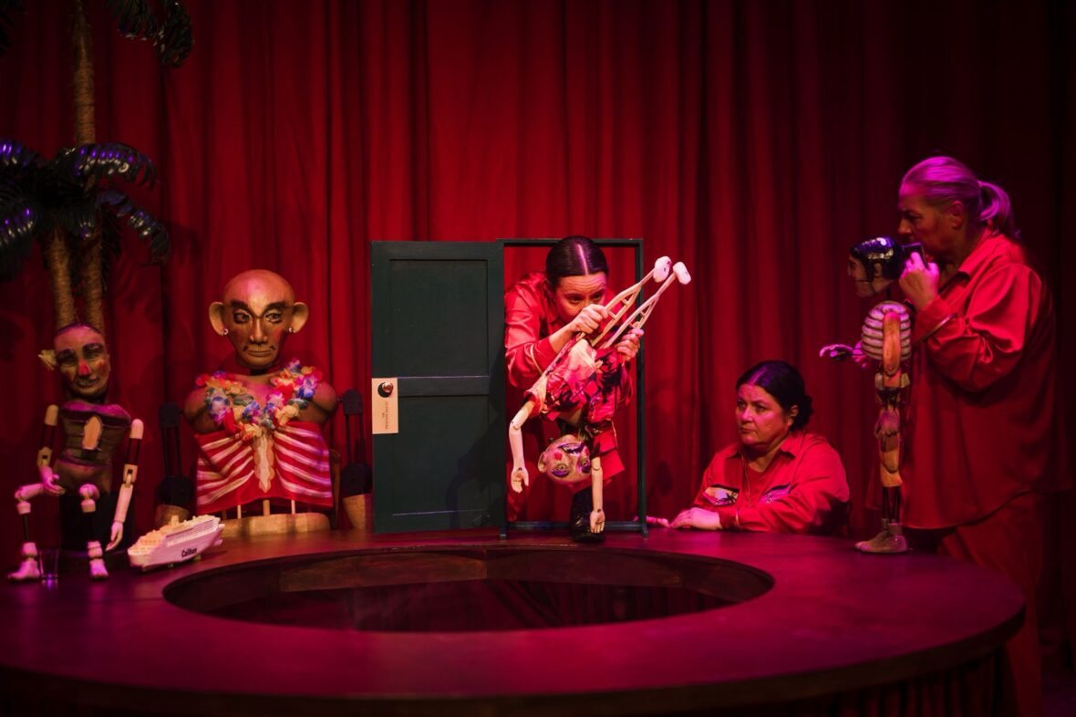 Obity czerwonym materiałem okrąg stanowi pole działania głównych lalkowych postaci. Animowane są wymiennie przez czworo aktorów (Agnieszka Harasimowicz, Honorata Mierzejewska-Mikosza, Agnieszka Roszko i Roman Wołosik), także ubranych na czerwono. Pięć lalek to stolikówki, zaś dwie postacie z kręgu mistycznego (wampiryczna Daisy oraz mędrzec hinduski, Mahatma Guru) to duże korpusy bez nóg, przenoszone lub przewożone na stojaku, giętkie, z wyrazistymi, przerysowanymi głowami i rękami, animowane z tyłu. Lalki „zwykłych” ludzi (pisarz Zenon, jego narzeczona Betsy, jej brat Joe, dawna kochanka Zenona Ada i jej mąż Henryk) mają około 70 centymetrów wysokości, są głównie z drewna, mają giętkie ręce i nogi, powiększone głowy, Zenon i Joe przypominają kościotrupy. Zenon nawiązuje do lalek trikowych, bowiem w miarę zagłębiania się w spirytyzm część jego twarzy zamienia się w szczękę nagiej czaszki.