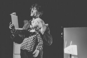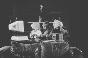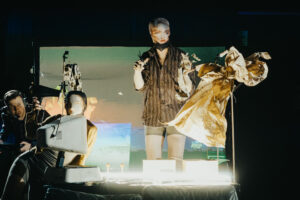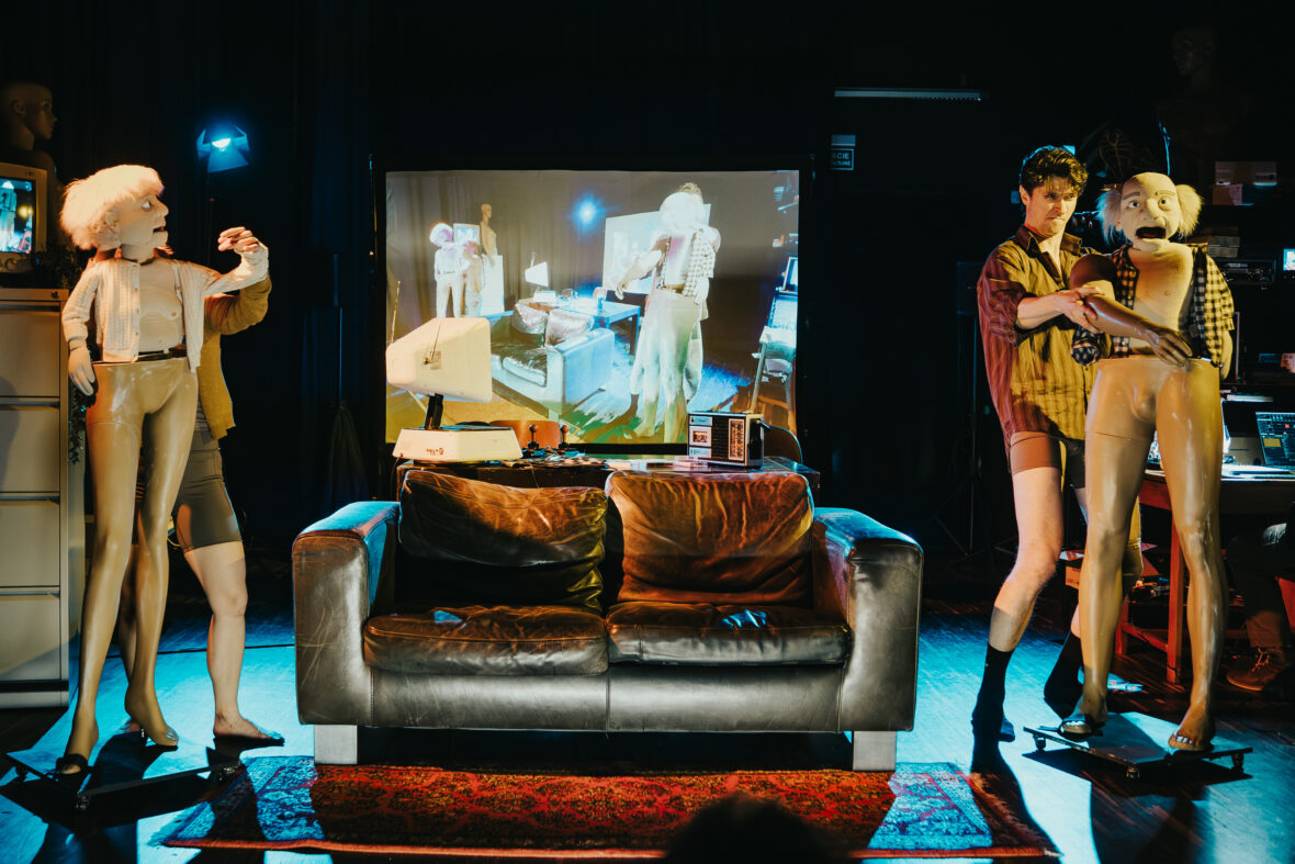 Żeby opisać ten spektakl trzeba się z nim spotkać więcej niż raz. Stąd pozwalam sobie wyłącznie na garść refleksji. W przedstawieniu nie ma pustych miejsc. Scenariusz jest bogaty i błyskotliwy. Działania sceniczne wypełniają każdą sekundę. Każda scena wywołuje dziesiątki skojarzeń odnoszących się do tropów literackich, muzycznych, popkulturowych, społecznych, nie mówiąc już o odniesieniach teatralnych, zarówno związanych z konwencjami teatralnymi, życiem artystycznym, jak i organizacyjnym. A osią całości są właśnie lalki, dwie główne postaci staruszków, partnerzy, małżeństwo. Troszkę to muppety, korpusy z dużymi głowami, z mimicznymi obliczami, wciąż gadające, zaopatrzone w jedną żywą rękę animatora, kobieta – Dagmary Sowy, mężczyzna – Pawła Chomczyka. Siedzą przy zagraconym biurku, w jakimś laboratorium twórczym i oddają się dość archaicznym grom komputerowym, z epoki Atari, a ich działania obserwujemy na horyzontalnie zawieszonym ekranie. W laboratorium jest też współczesny artysta multimedialny (Sebastian Łukaszuk), siedzący z boku sceny, tyłem do widowni, zajęty obsługą przedstawienia i animacją komputerowego animatroniksa z wielkim otwierającym się okiem na ekranie. Ten animatroniks to wyzwanie współczesności, taki ChatGPT. W scenie poszukiwania tematów w literaturze – od Malinowskiego, przez Jurkowskiego, po Hitlera – proponowane przez komputer hasła są olśniewające, a każda sekwencja aż się prosi o komentarz. Sztuczna inteligencja podpowiada, jak interpretować wymieniane książki tak, by można było wykorzystać animanty.
